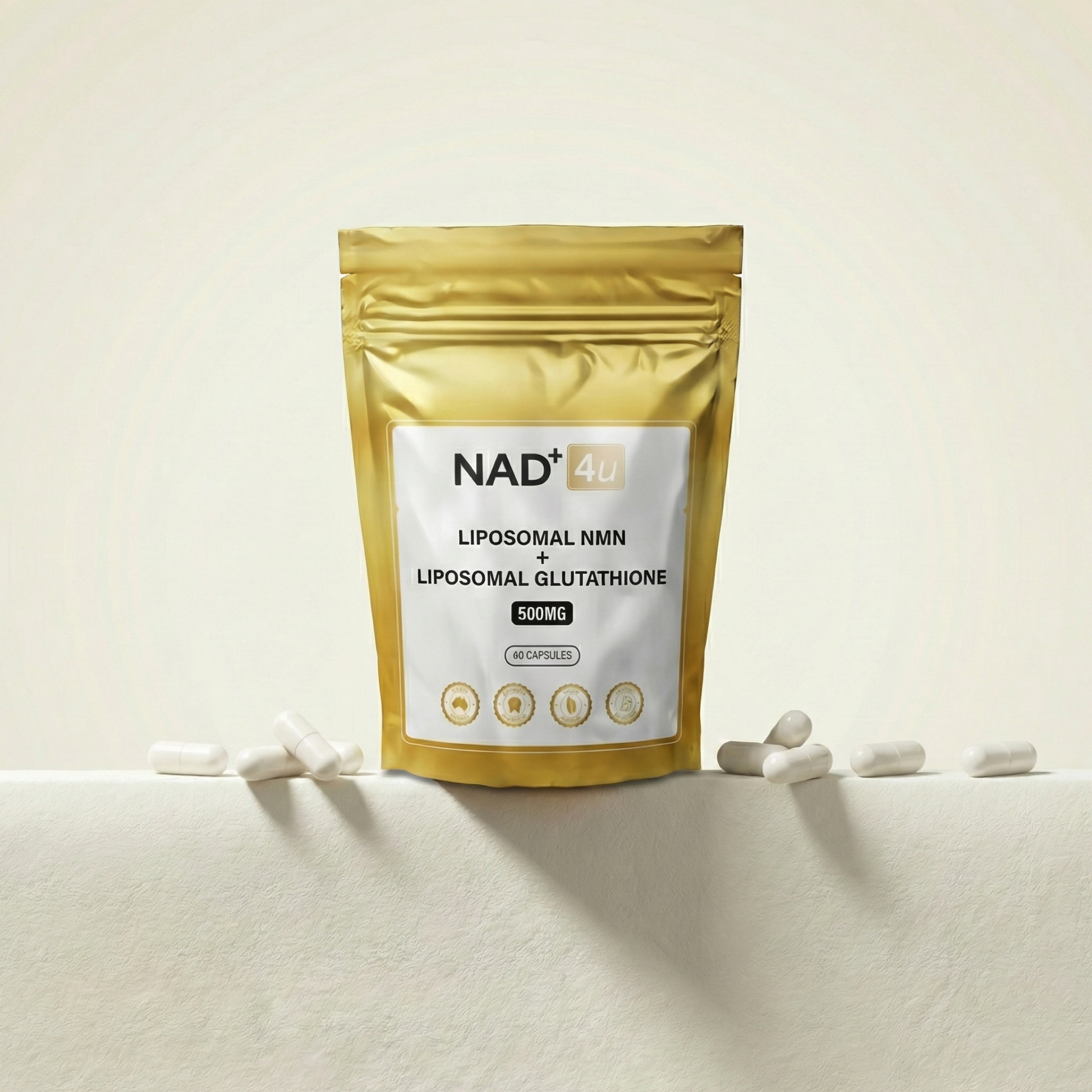 NAD+ 4u NMN + Glutathione is a potent supplement designed to naturally support NAD+ production, helping improve energy, cellular repair, and longevity.